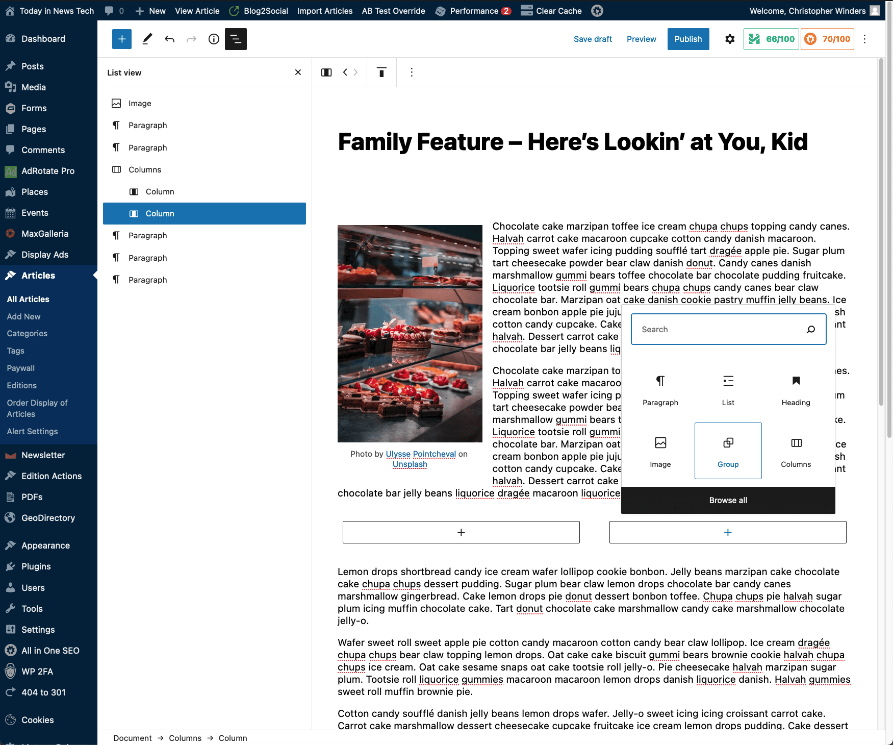 Starting with an article in progress, the headline, body text and a featured photo have been placed. Beneath the second paragraph we will use the Columns block to split the main body text to the left, wrapping around the recipe (using a List block) aligned right.